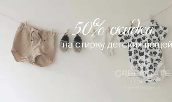 Мы знаем, как быстро дети пачкаются, поэтому дарим 50% скидку на услуги прачечной при стирке одежды для детей до 12 лет включительно.